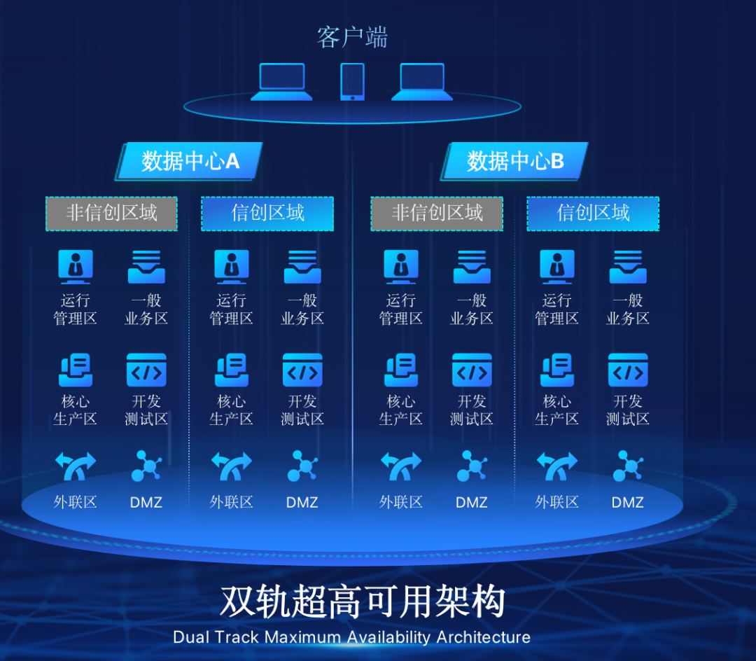 米兰·(milan)中国在企业面临自主创新IT基础重构过程中,推出的全新架构双轨超高可用架构(简称DTMAA),在双活数据中心的分区调度基础上,添加每个数据中心内信创域和非信创域的分域调度,来实现分区分域协同的多活双轨超高可用。